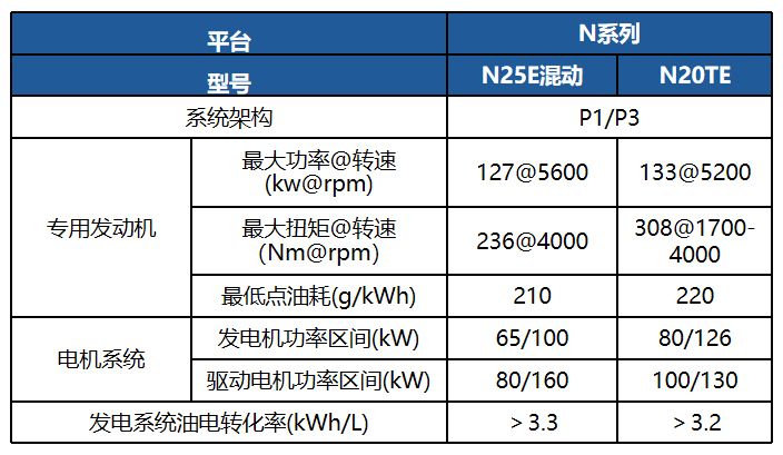 基于N系列發動機(jī)開(kāi)發的(de)适配增程混動車(chē)型,最大(dà)輸出功率130kW;适用(yòng)于B級轎車(chē)、中大(dà)型SUV、皮 卡等車(chē)型。